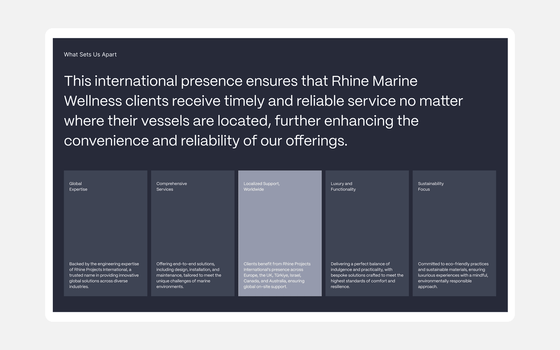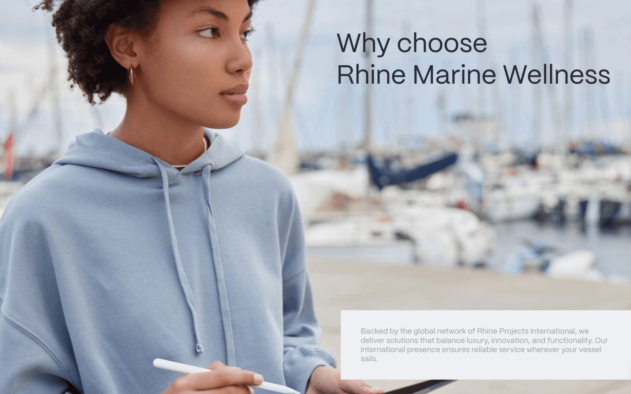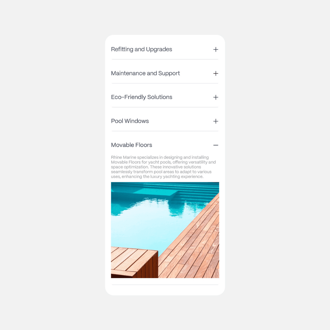 Our client, a global marine wellness and engineering brand, sought a digital presence that would accurately reflect their technical expertise while communicating a sense of luxury and reliability. Operating in the highly specialized yacht and cruise ship sector, Rhine Marine Wellness required a website that could clearly present complex services while maintaining a refined and confident visual language.