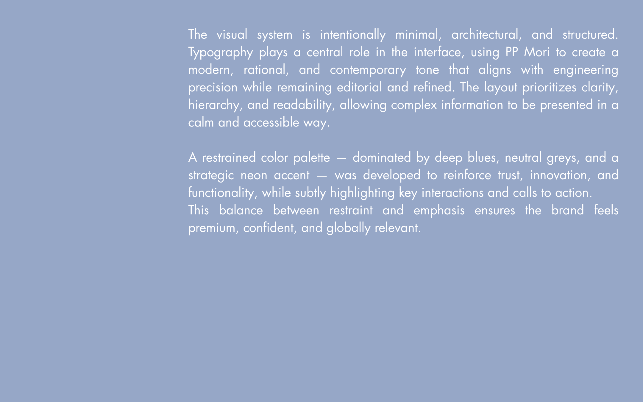 The focus of this project was to design and structure a comprehensive website that translates engineering precision into a calm, premium, and globally consistent digital experience.